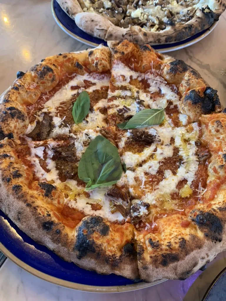 Vicky: Today we’re tasting a pizza called Ricordi d’Infanzia — it translates to “Childhood Memories” — made with your nonna’s slow-cooked beef ragu, a thick Neapolitan base, and aged Parmigiano. It’s a wonderful, unusual pizza. The crust is so fluffy, it doesn’t go soggy!