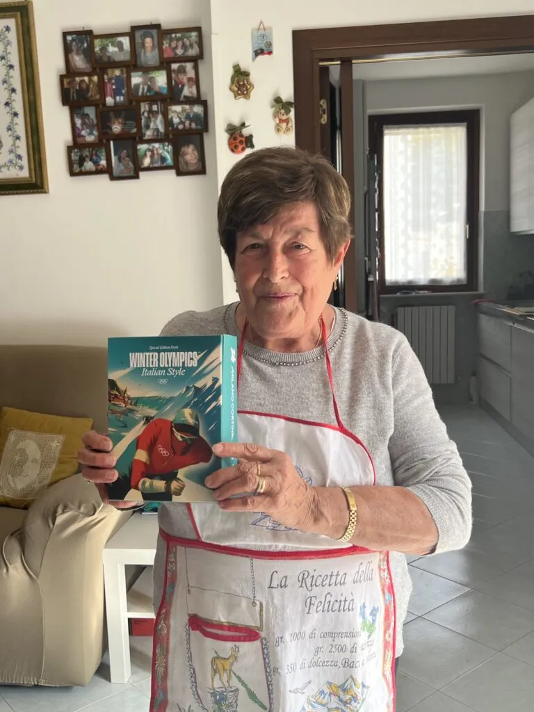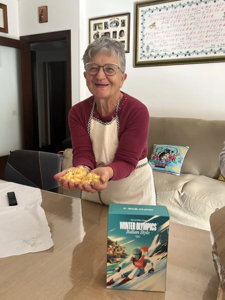 Adriana is particularly skilled in the saltarello and the scarpetta dances, typical of Cingoli, and she loves teaching her grandchildren. Nonna Adriana says she’s a bigger sports fan than her husband, and when she’s not fixated on figure skating or football, she’s cooking. She loves to make classic dishes. For her Olympic pasta she’s paired it with a fennel and pork sauce. It’s great for athletes, although watch her video to the end and you’ll see there’s a splash of an ingredient that might not get past a kitchen dope-test. Don’t drink and ski, friends.