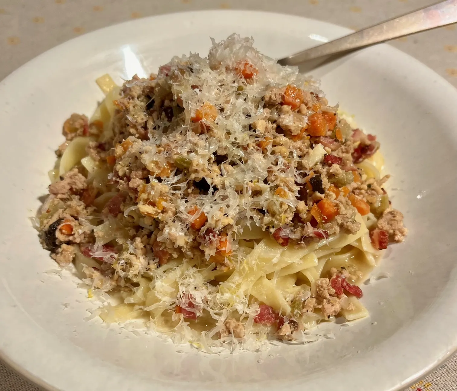 • Ladle the ragu onto the pasta (pick out the bay leaves if desired), and finish with another drizzle of olive oil, and a generous grating of Parmigiano.